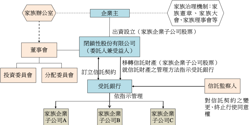 閉鎖性股份有限公司再將其所持有之家族企業子公司之股票以自己為委託人及受益人交付信託。並由企業主選任合適人選擔任信託監察人,信託之提前終止及變更需取得信託監察人之同意;此時受託人成為家族企業子公司之控股股東,閉鎖性股份有限公司則享有信託受益權。