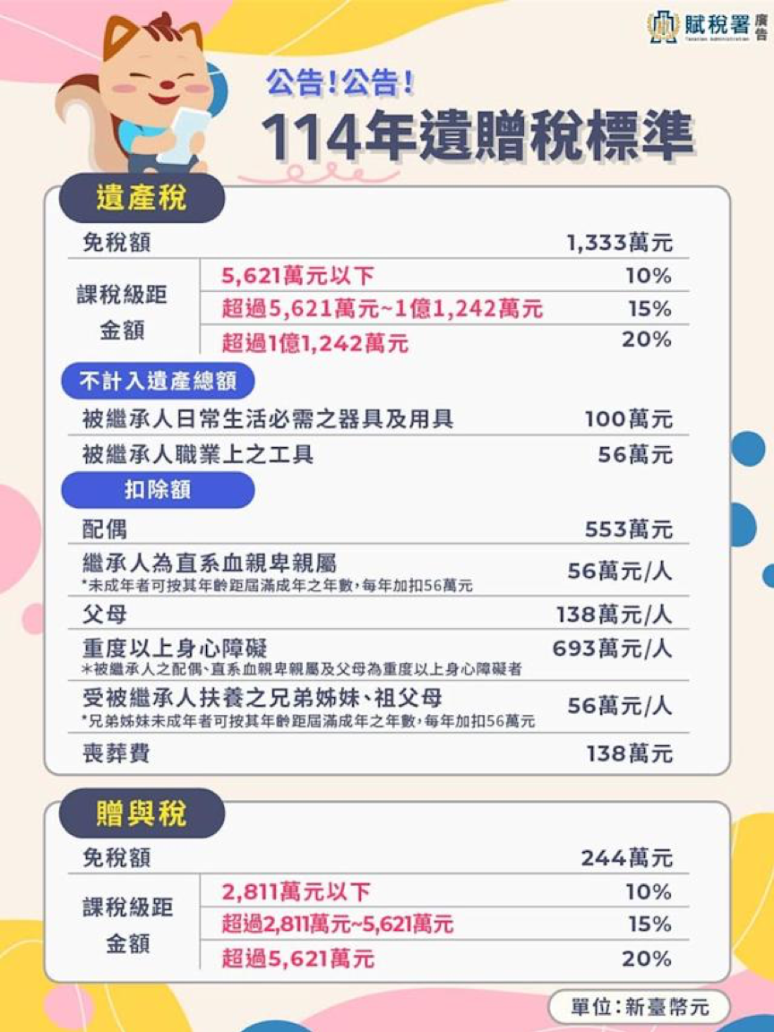 依遺贈稅法第12條之1第1項規定,遺贈稅之各項金額,每遇消費者物價指數較上次調整之指數累計上漲達10%以上時,自次年起按上漲程度調整之。前述物價指數係指:行政院主計總處公布,自前一年11月起至該年10月底為止12個月平均消費者物價指數。114年發生之繼承或贈與案件適用遺產及贈與稅法規定之免稅額為新臺幣(下同)1,333萬元。課稅級距金額並未調整仍為: