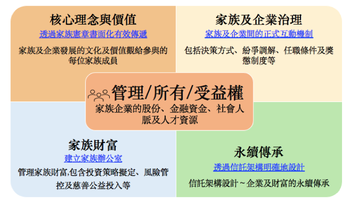 如圖所歸納出公司治理與家族治理的關連互動,係以管理權、所有權及受益權為核心,串連包括核心理念與價值、家族及企業治理、家族財富以及永續傳承等四大面向。在核心理念與價值的部分,乃透過家族憲章書面化,而得以將家族及企業發展中所累積的文化以及價值觀,有效傳遞給每一位參與的家族成員。在家族及企業治理的部分,所涉及的正式互動機制,包括決策方式、紛爭調解、任職條件及獎懲制度等。家族財富的部分,則透過建立家族辦公室來管理家族財富之要務,包括投資策略擬定、風險管控及慈善公益投入等經濟行為。最後,則是在永續傳承的部分,透過信託架構設計,明確管理、所有以及受益權三項權利均獲得保障的前提下,隨著企業暨公司成功經營及獲利,讓家族財富持續累積與傳承。